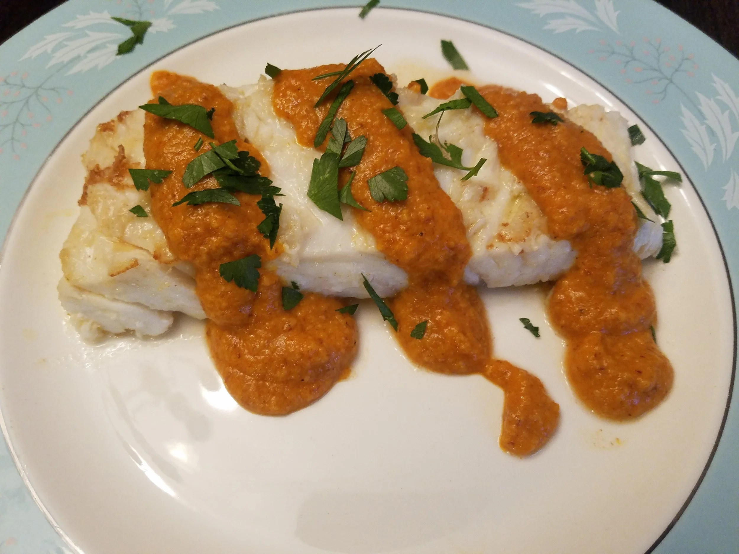 SAUTEED HALIBUT WITH ROMESCO SAUCE